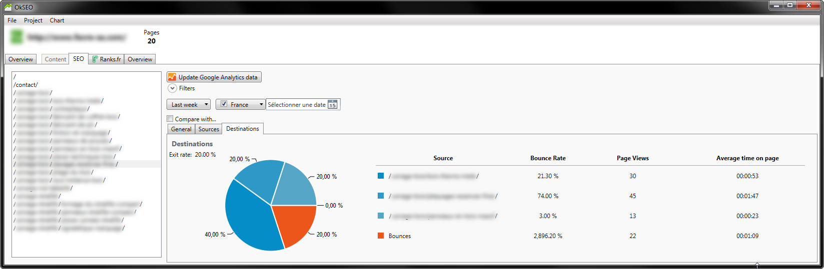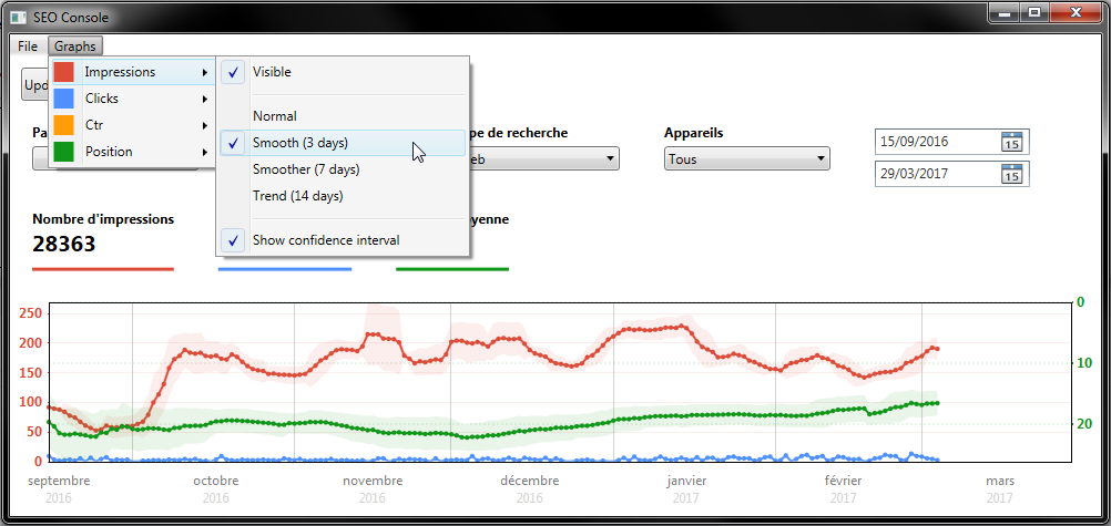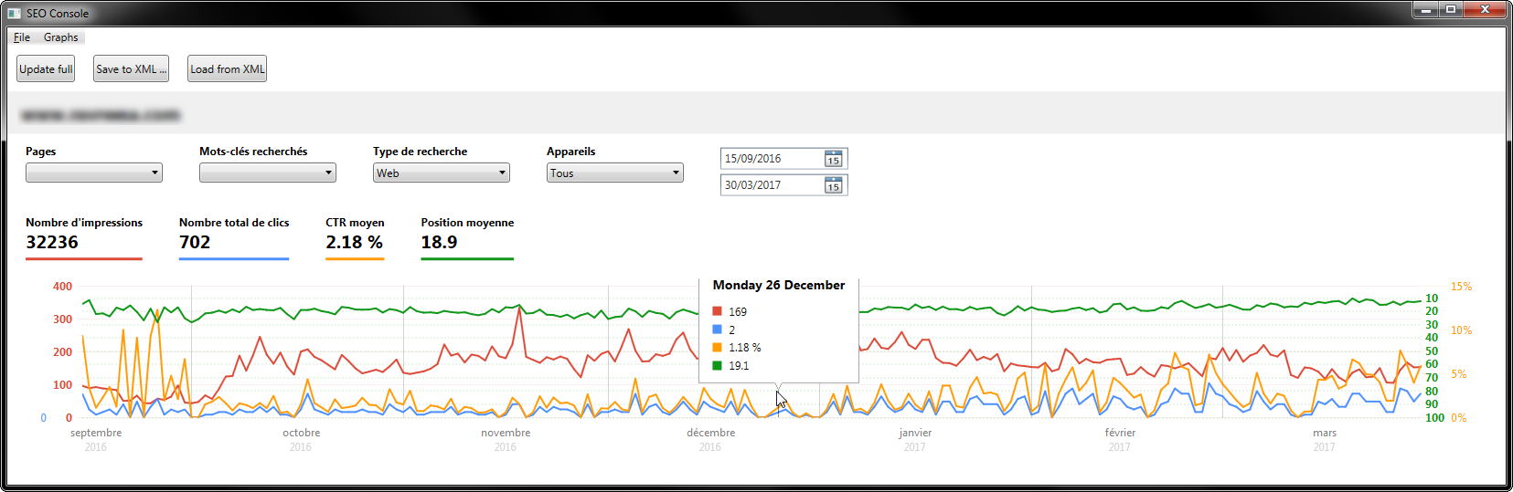 - Statisiques des pages (position, impressions, clics, ctr)
